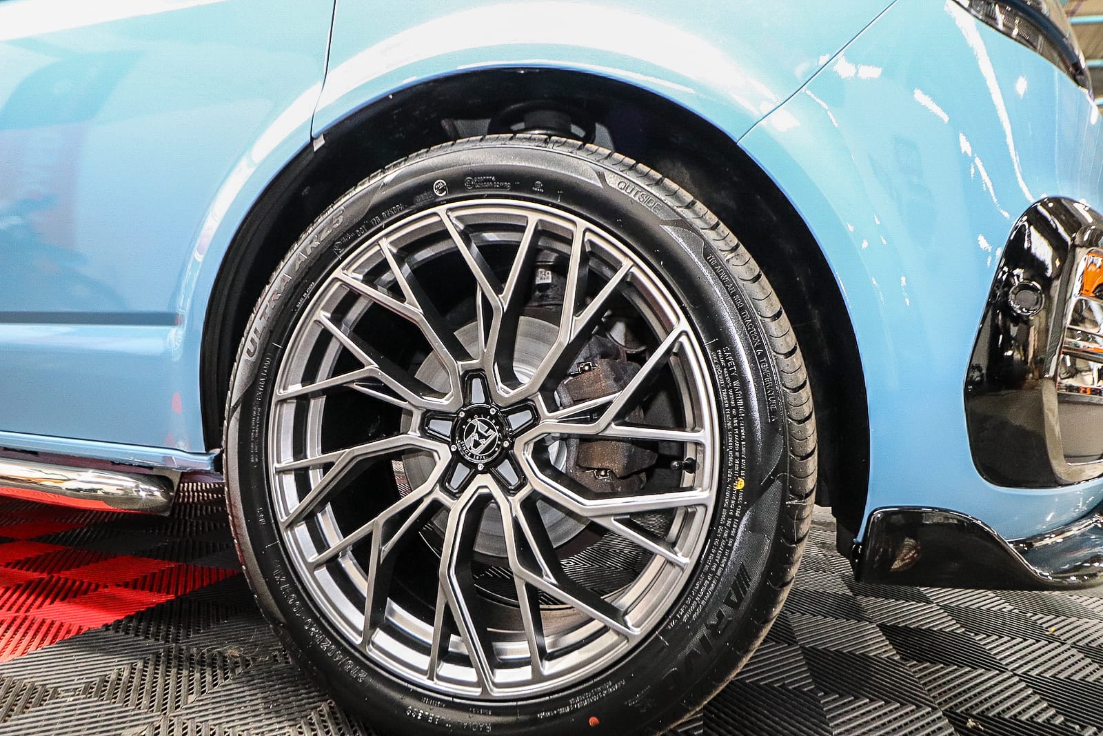 A true Retro Style show-stopper finished in Baby Blue over White with stance-enhancing lowered suspension and 20″ carbon-style black alloys. This Signature Series T6.1 blends timeless looks with premium comfort and off-grid capability.